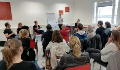 Am Dienstag ging es los in der Gudrunstraße: Hier haben wir in einem ExpertInnentalk unsere Konzepte zur ambulanten Alkoholbehandlung vorgestellt. Die ISG wurde dabei von Dr.Aglaja Sedelmeier und Mag.Raimund Wöss kompetent vertreten. Dazu hatten wir Mag.a (FH) Katharina Humer, Leiterin des regionalen Kompetenzzentrum (rKomZ), ebenfalls als Rednerin gewinnen können, um neben unserer Behandlungsperspektive auch die Sichtweise der ZuweiserInnen darzustellen. Da wir uns besonders an HausärztInnen wenden wollten, hatten wir zuvor über 350 AllgemeinmedizinerInnen brieflich angeschrieben und eingeladen: Und tatsächlich: die Veranstaltung war gut besucht!